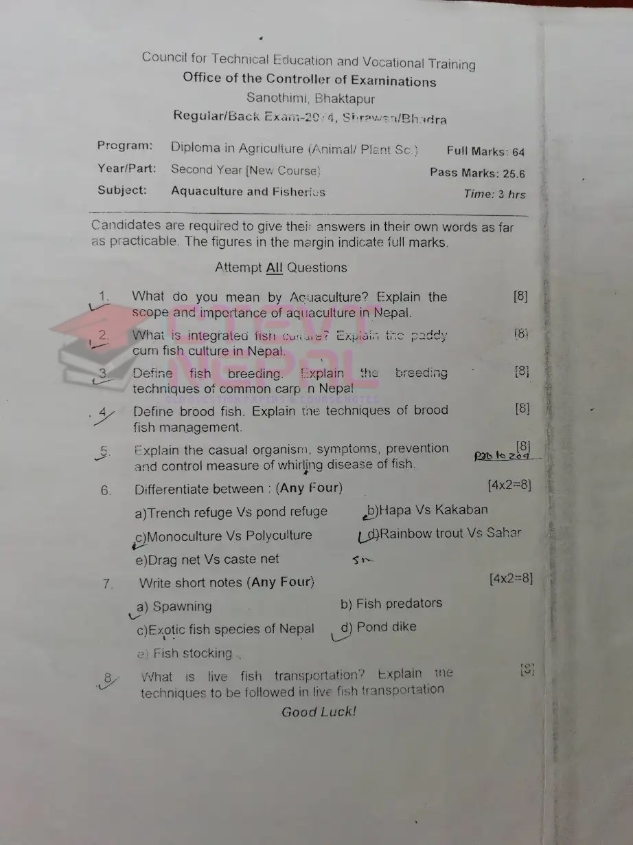 Aquaculture and Fisheries - 2nd Year Question Papers CTEVT | Diploma in Agriculture (Animal / Plant Science)